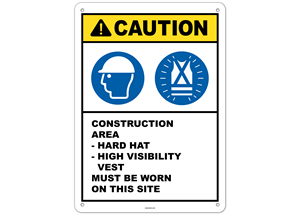 Caution Construction Area - Hard Hat - High Visibility Vest Must Be Worn On This Site Sign