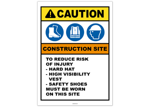 Caution Construction Site To Reduce Risk of Injury - Hard Hat - High Visibility Vest - Safety Shoes Must Be Worn On This Site Sticker