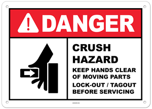 Danger Crush Hazard Keep Hands Clear of Moving Parts Lock-out / Tagout Before Servicing Sign