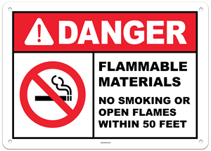 Danger Flammable Materials No Smoking or Open Flames Within 50 Feet Sign