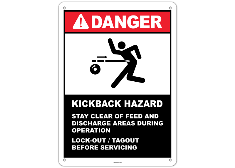 Danger Kickback Hazard Stay Clear of Feed and Discharge Areas During Operation Sign 3