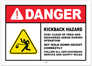 Danger Kickback Hazard Stay Clear of Feed and Discharge Areas During Operation Set Hold Down Height Correctly Sticker