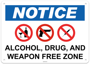 Notice Alcohol, Drug, and Weapon Free Zone Sign