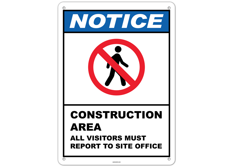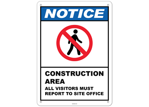 Notice Construction Area All Visitors Must Report to Site Office Sign