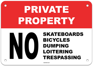 Private Property No Skateboards Bicycles Dumping Loitering Trespassing Sign