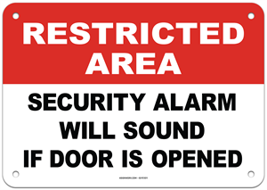 Restricted Area Security Alarm Will Sound if Door is Opened Sign