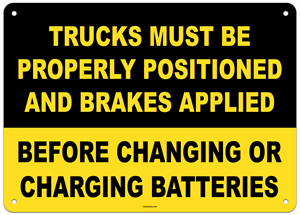 Trucks Must Be Properly Positioned Before Charging Batteries Sign
