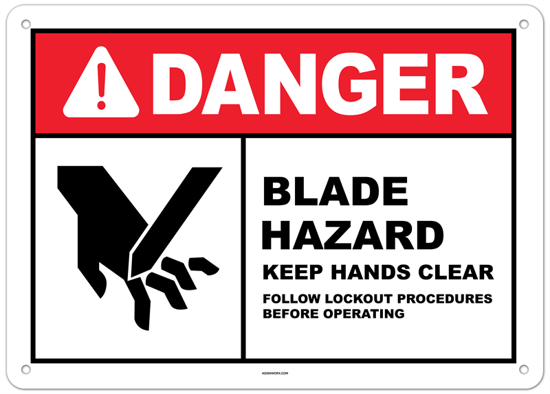 Danger Blade Hazard Keep Hands Clear Follow Lockout Procedures Before Operating Sign