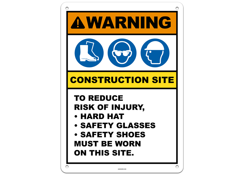 Warning Construction Site To Reduce Risk of Injury Hard Hat Safety Glasses Safety Shoes MUST Be Worn on this Site Sign