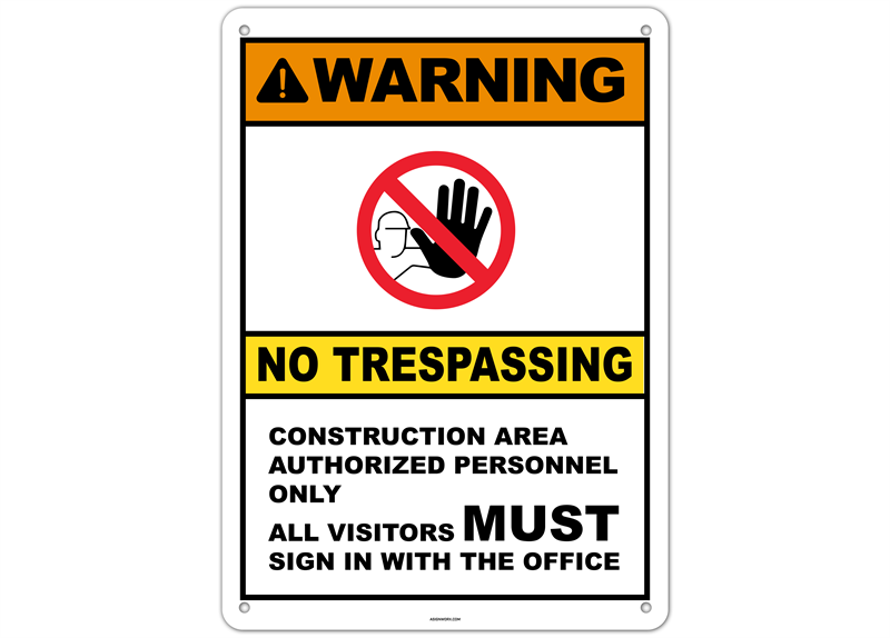 Warning No Trespassing Construction Area Authorized Personnel Only All Visitors Must Sign In With The Office Sign