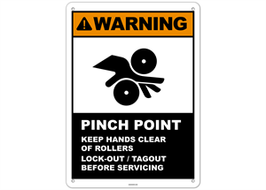 Warning Pinch Point Keep Hands Clear of Rollers Lock-out / Tagout Before Servicing Sign