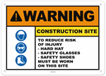 Warning Construction Site To Reduce Risk of Injury - Hard Hat - Safety Glasses - Safety Shoes Must Be Worn On This Site Sign