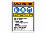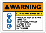 Warning Construction Site To Reduce Risk of Injury - Hard Hat - High Visibility Vest - Safety Shoes Must Be Worn On This Site Sign