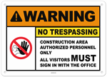 Warning No Trespassing Construction Area Authorized Personnel Only All Visitors Must Sign In With The Office Sign