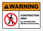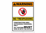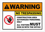 Warning No Trespassing Construction Area Authorized Personnel Only All Visitors Must Sign In With The Office Sticker
