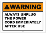 Warning Always Unplug the Power Cord Immediately After Use Sticker